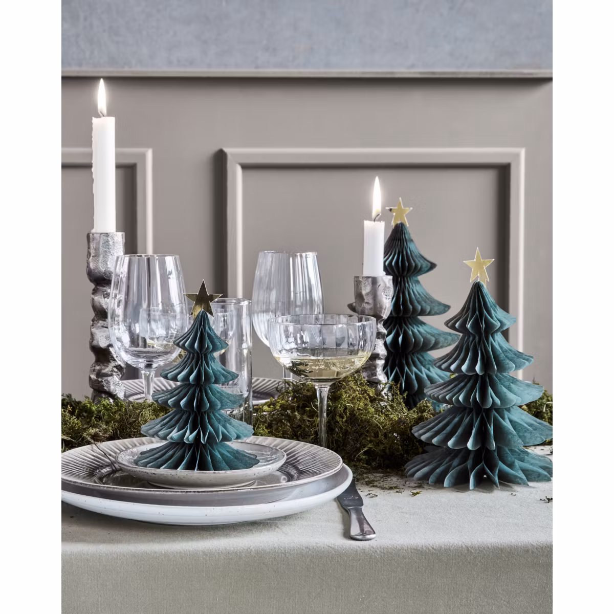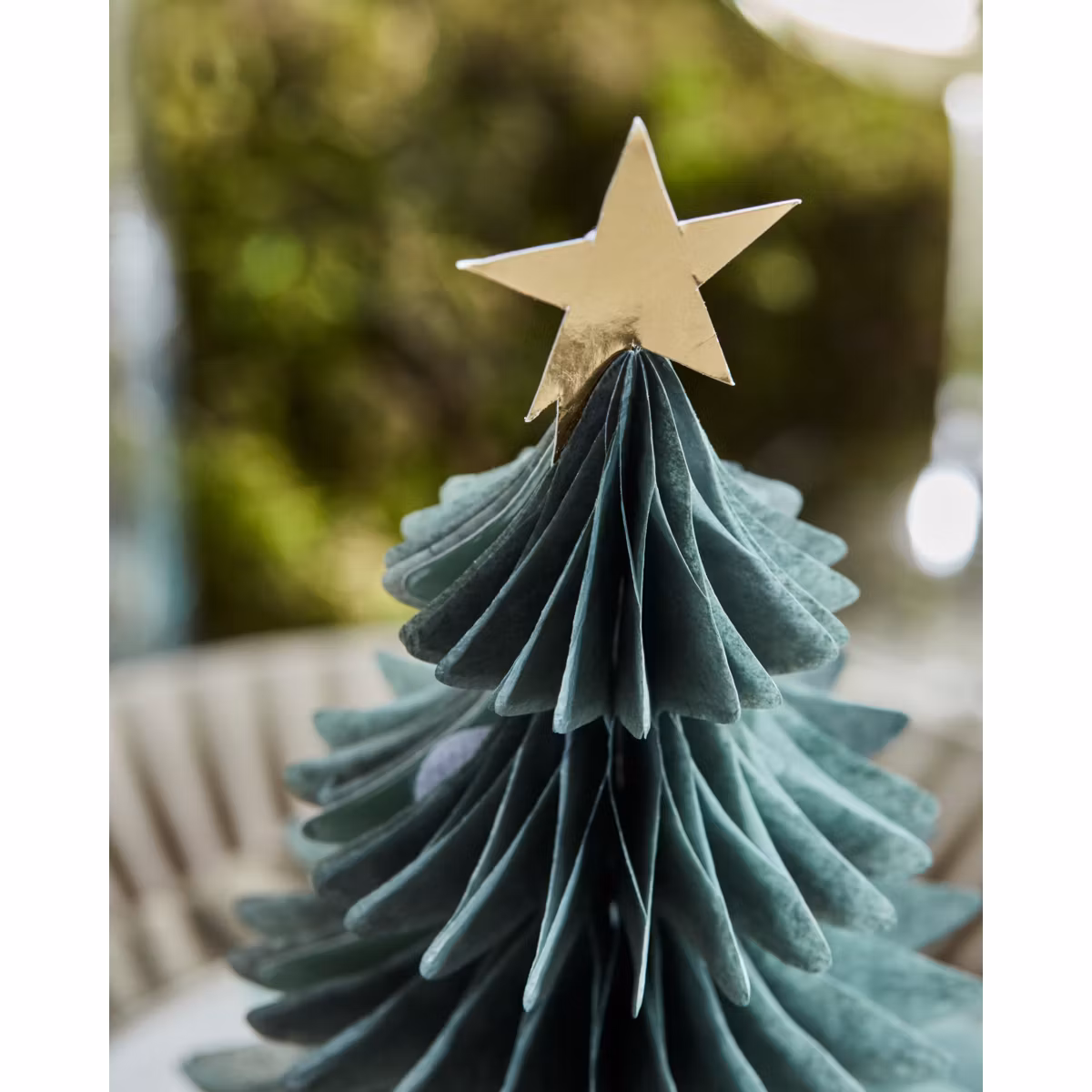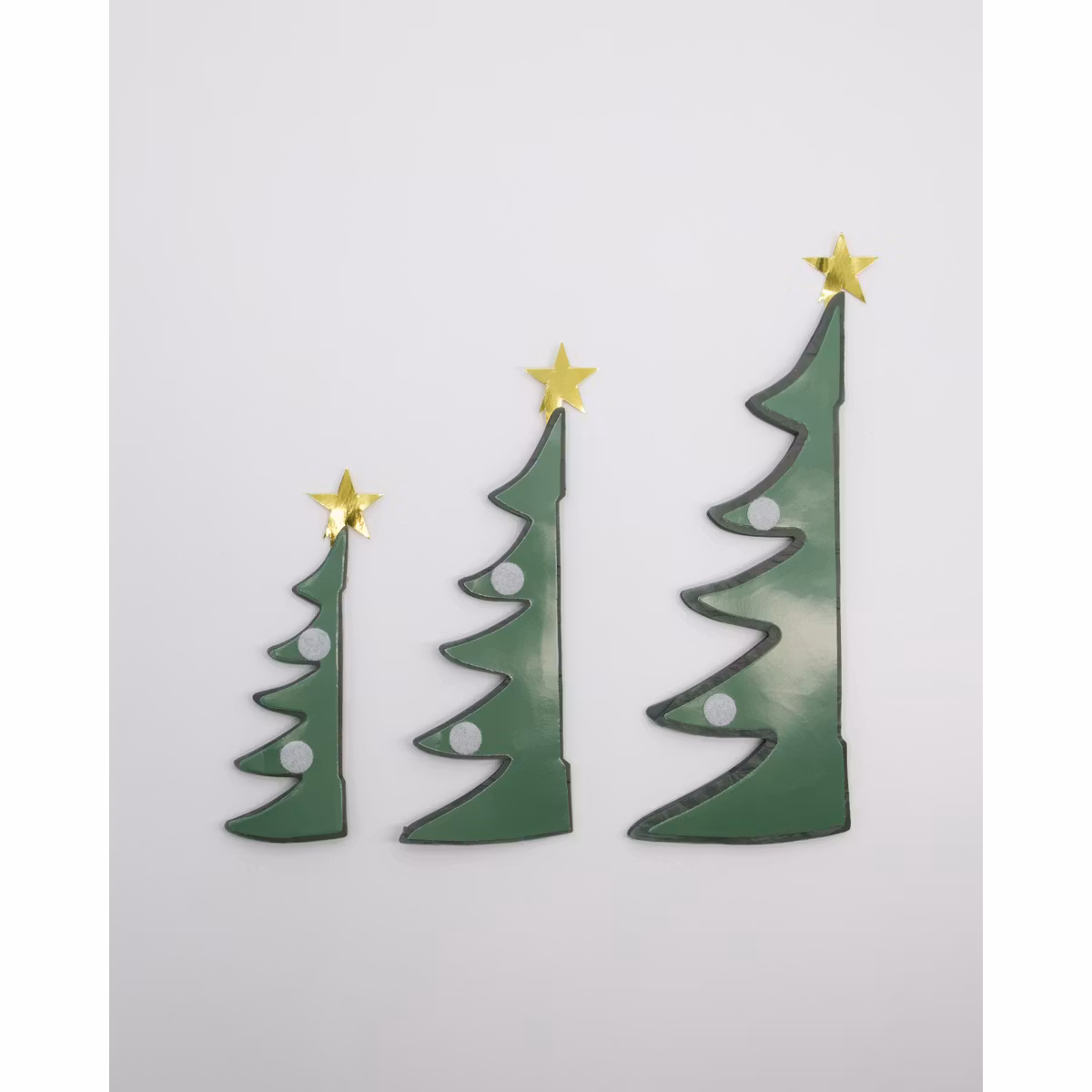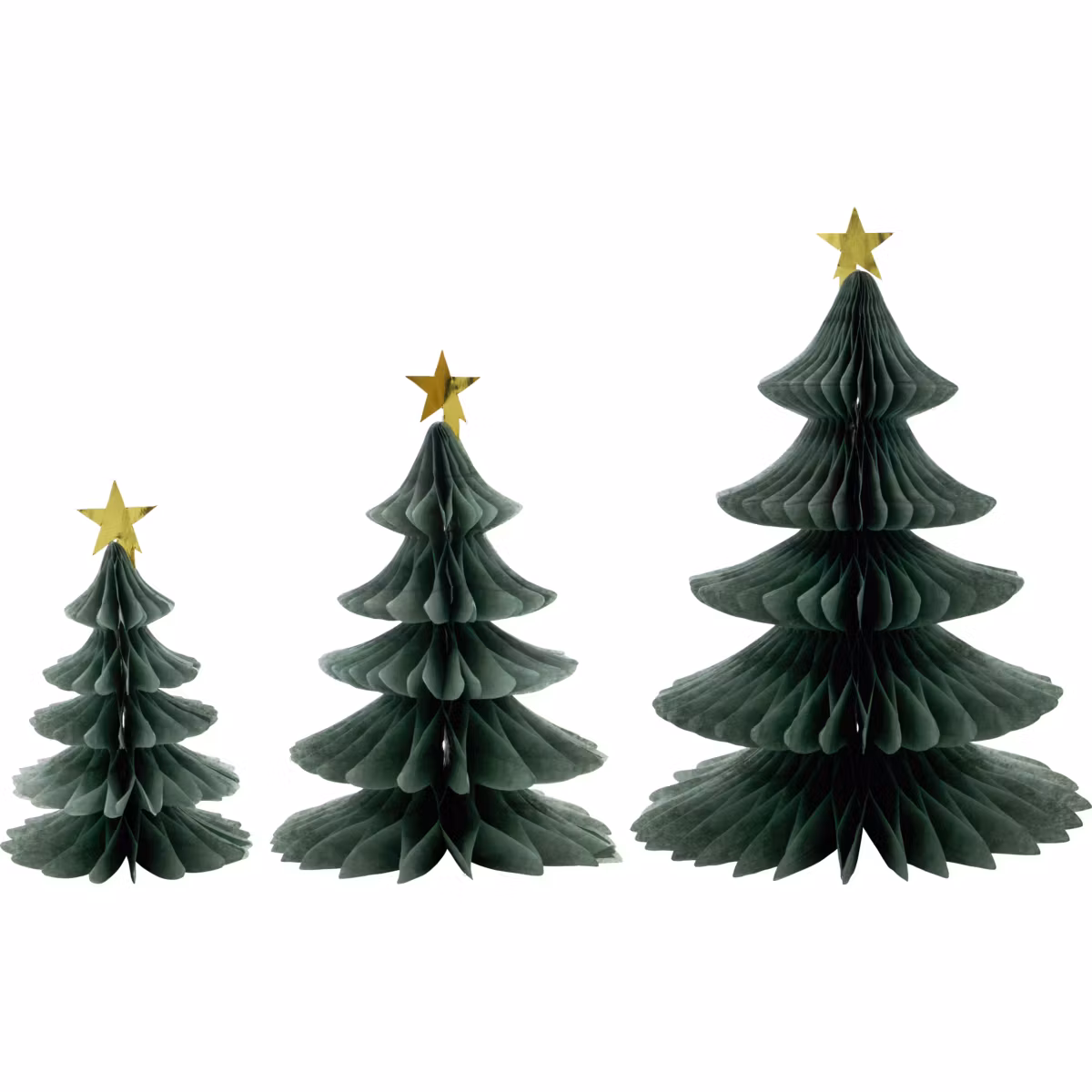 Set med 3 stycken dekorativa granar i papper.
