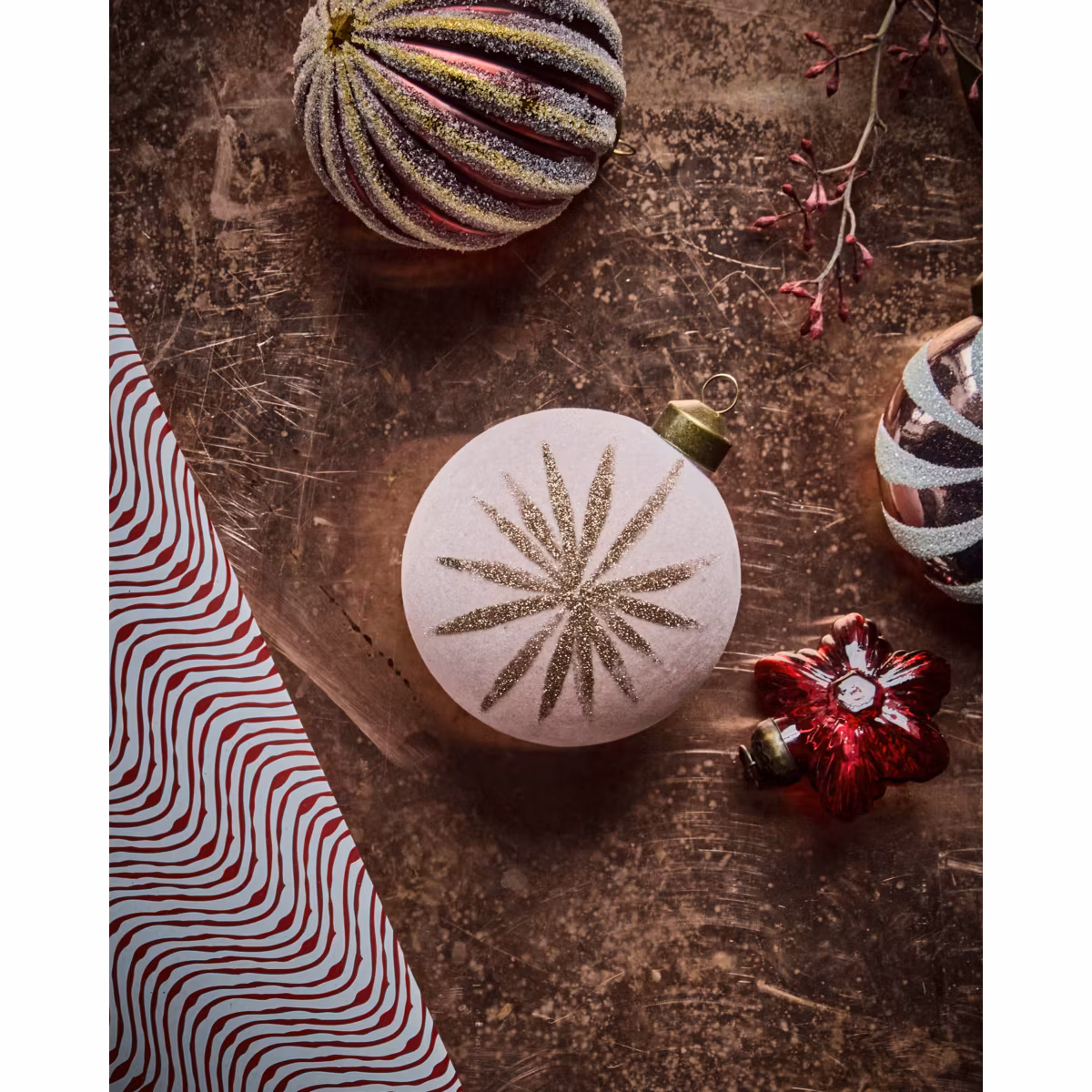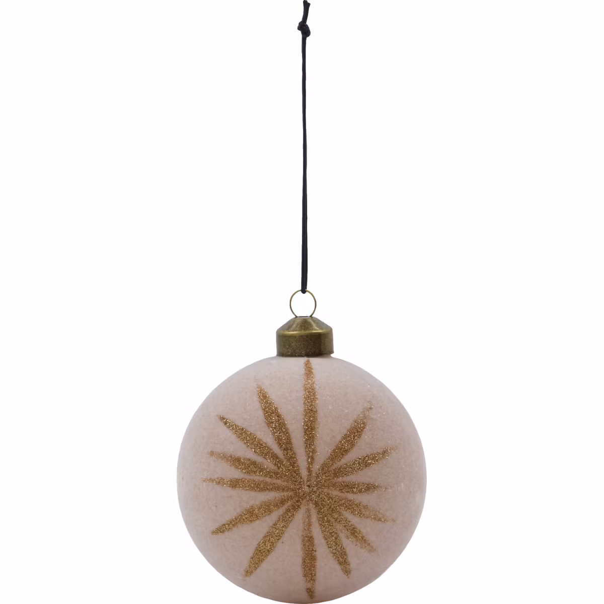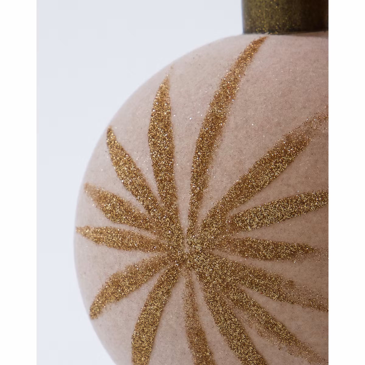 Den rosa velourfinishen ger en mjuk och feminin känsla. De champagnefärgade glimmerstjärnorna på varje kula skapar en strålande julstämning.