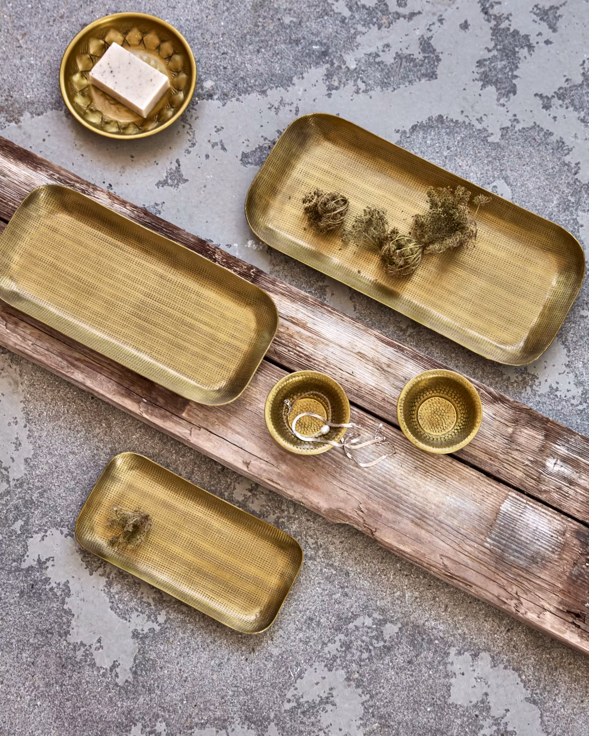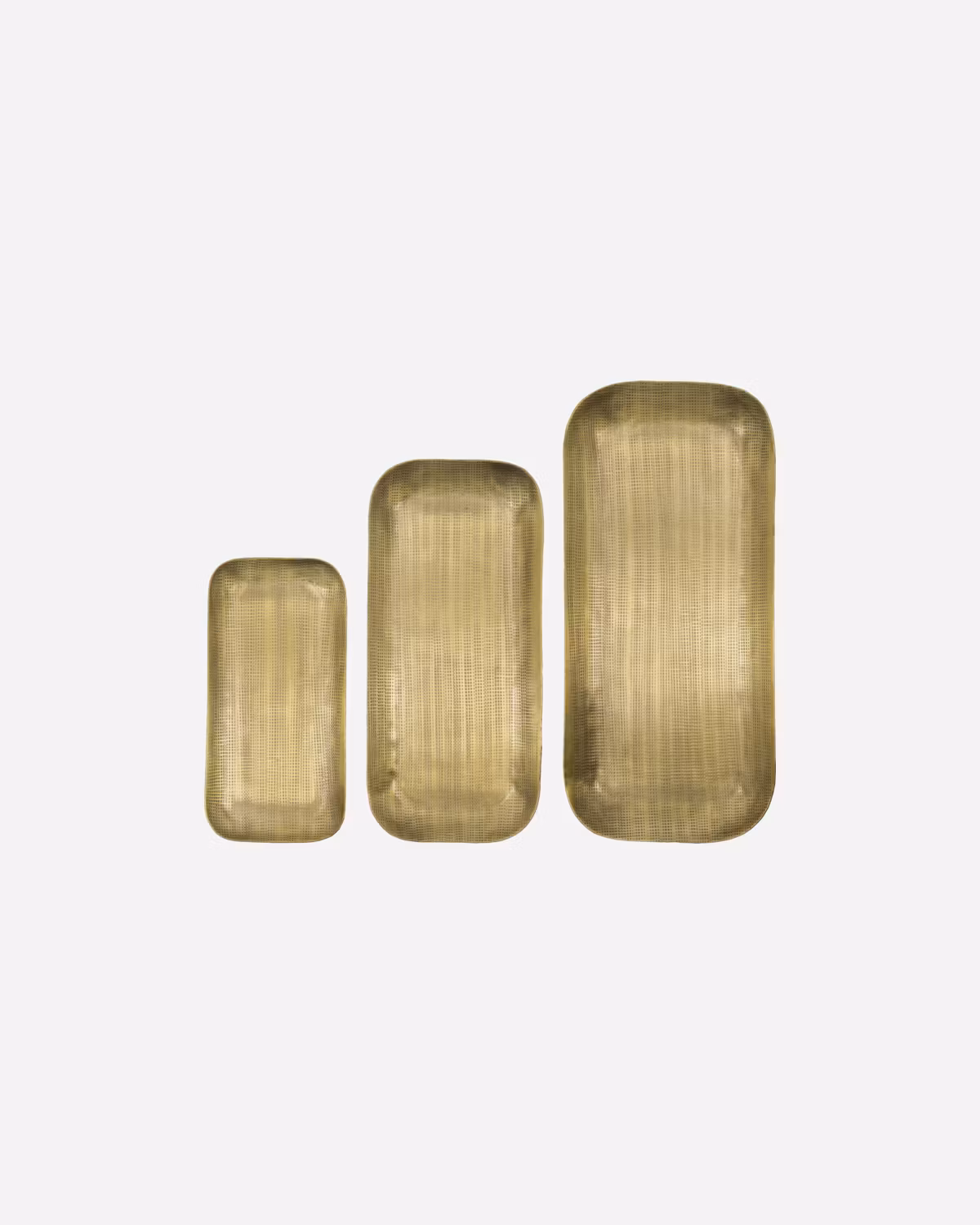 Tillverkad av slitstarkt aluminium är dessa brickor vackert präglade med ett unikt mönster. De är perfekta för både dekoration och funktionell servering och ger en elegant känsla vid alla tillfällen. Använd dem till exempel för att ställa fram ljus eller som serveringsbrickor under sammankomster och för att förhöja estetiken i vardagsrummet.