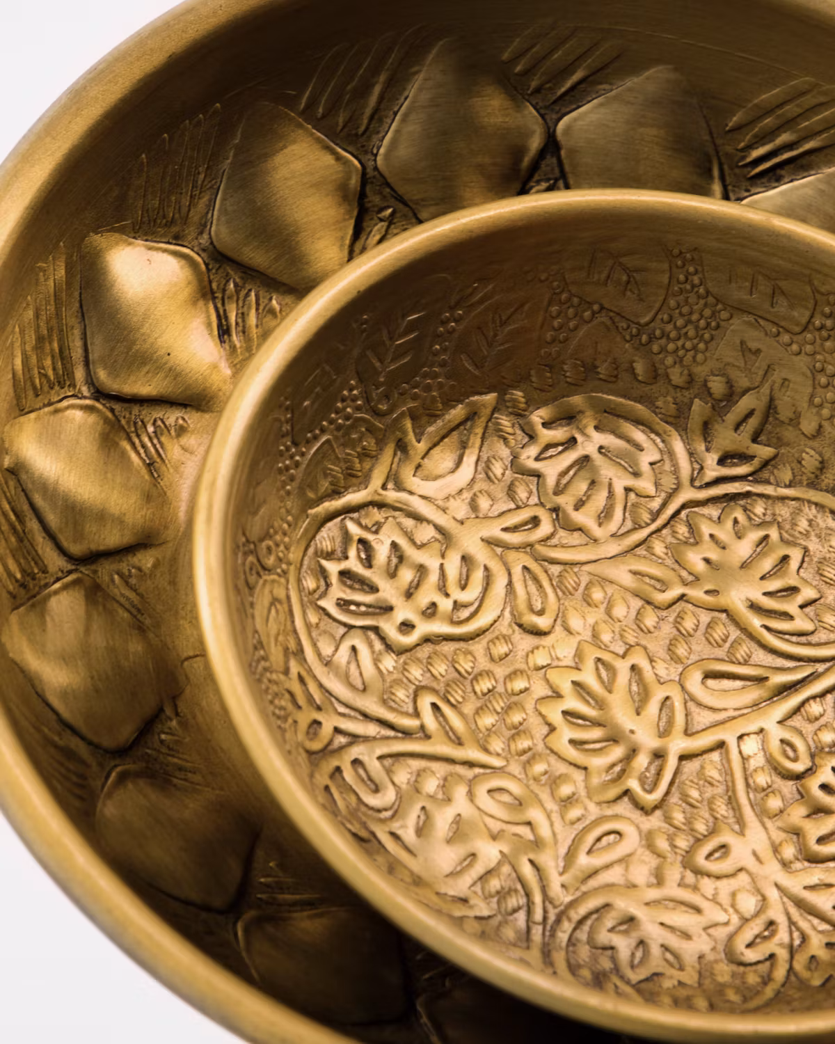 Dessa dekorativa föremål är tillverkade av aluminium och har ett fantastiskt präglat mönster och en antik finish. Perfekta för att hålla små blockljus eller smycken erbjuder dessa skålar oändliga stylingmöjligheter.