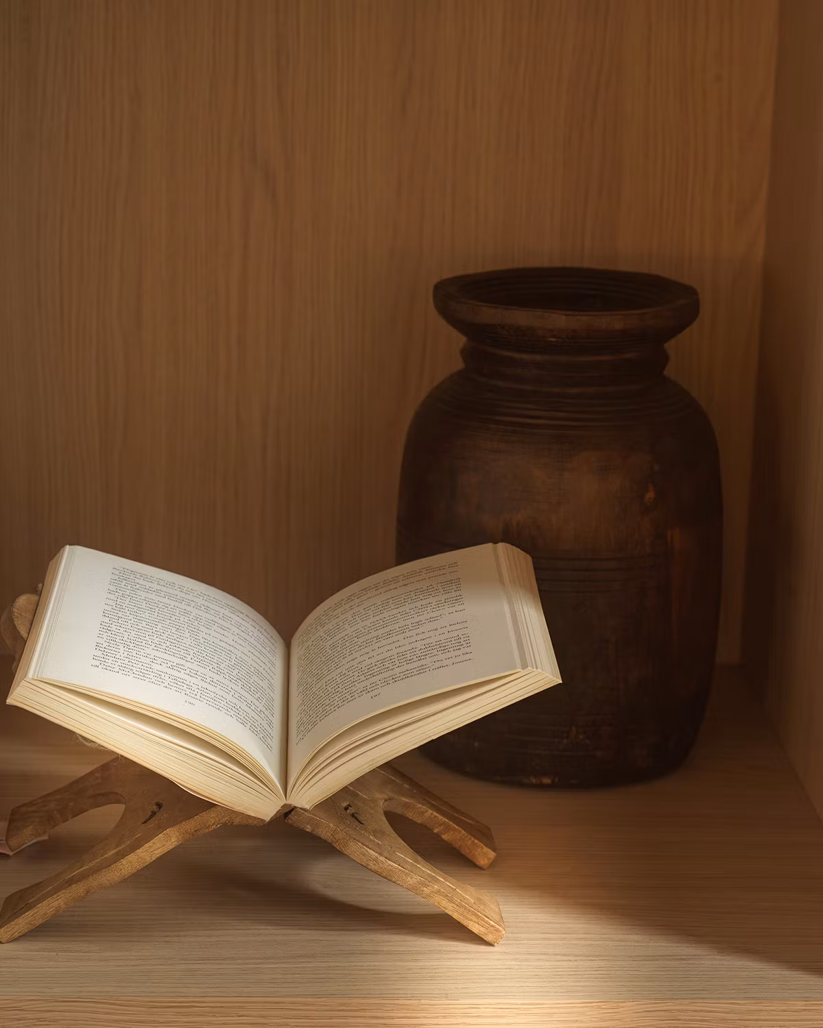 Handgjort unikt bokstöd i trä. Passar lika bra till kokboken i köket som till dekoration i vardagsrummet.