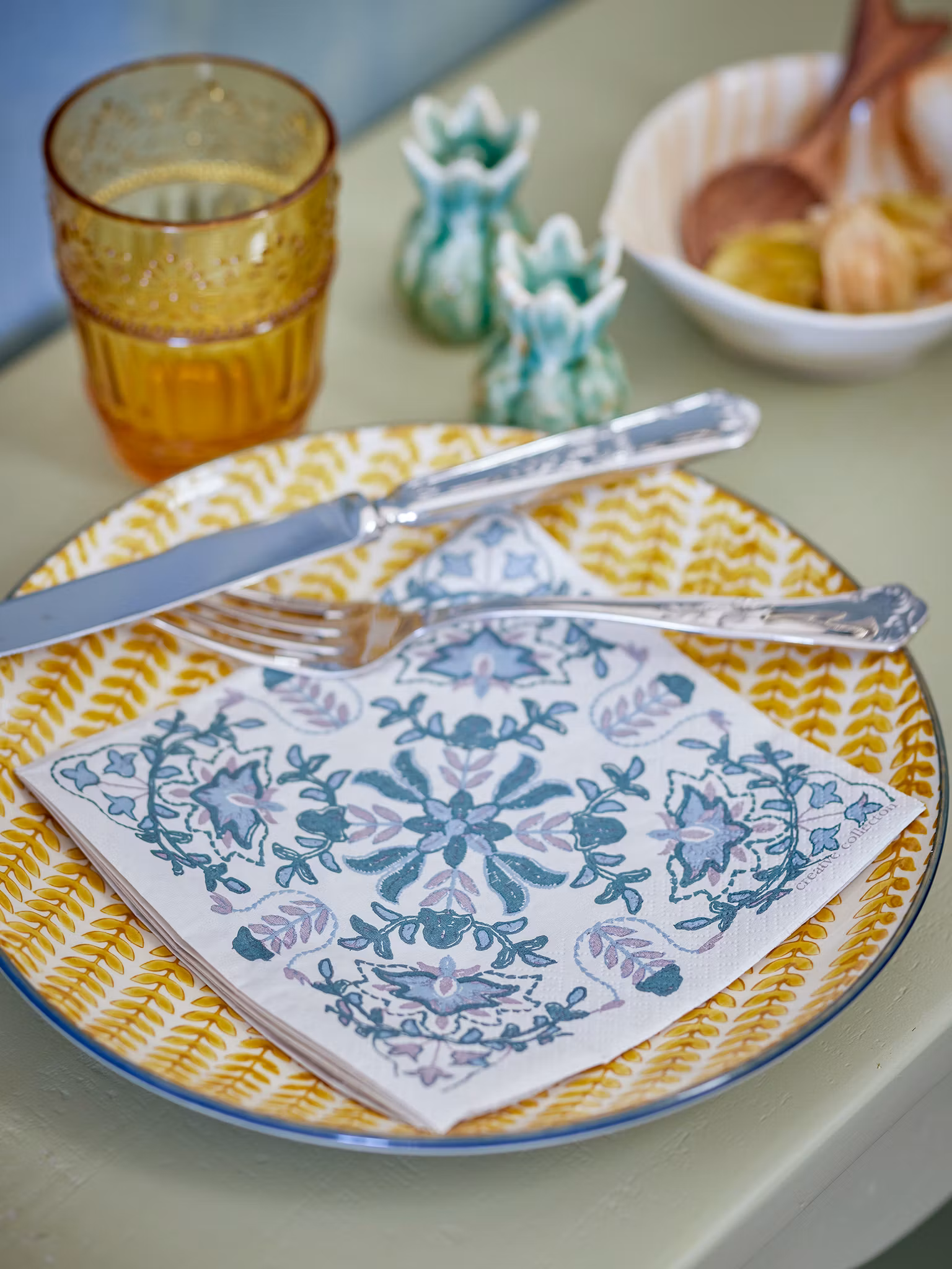 Vackert dekorerade servetter i grönt och blått. 20 st per paket i mått 33x33 cm.