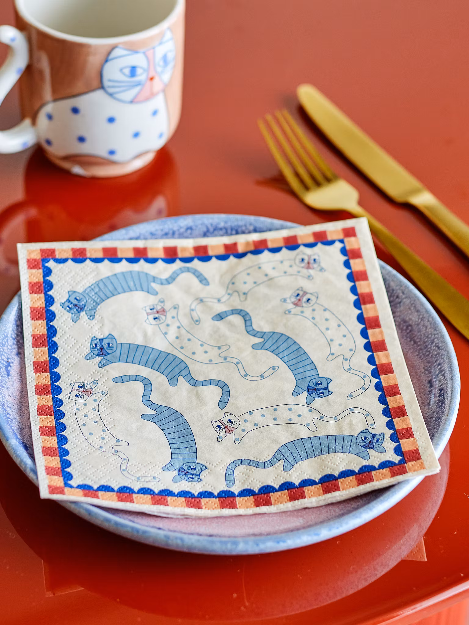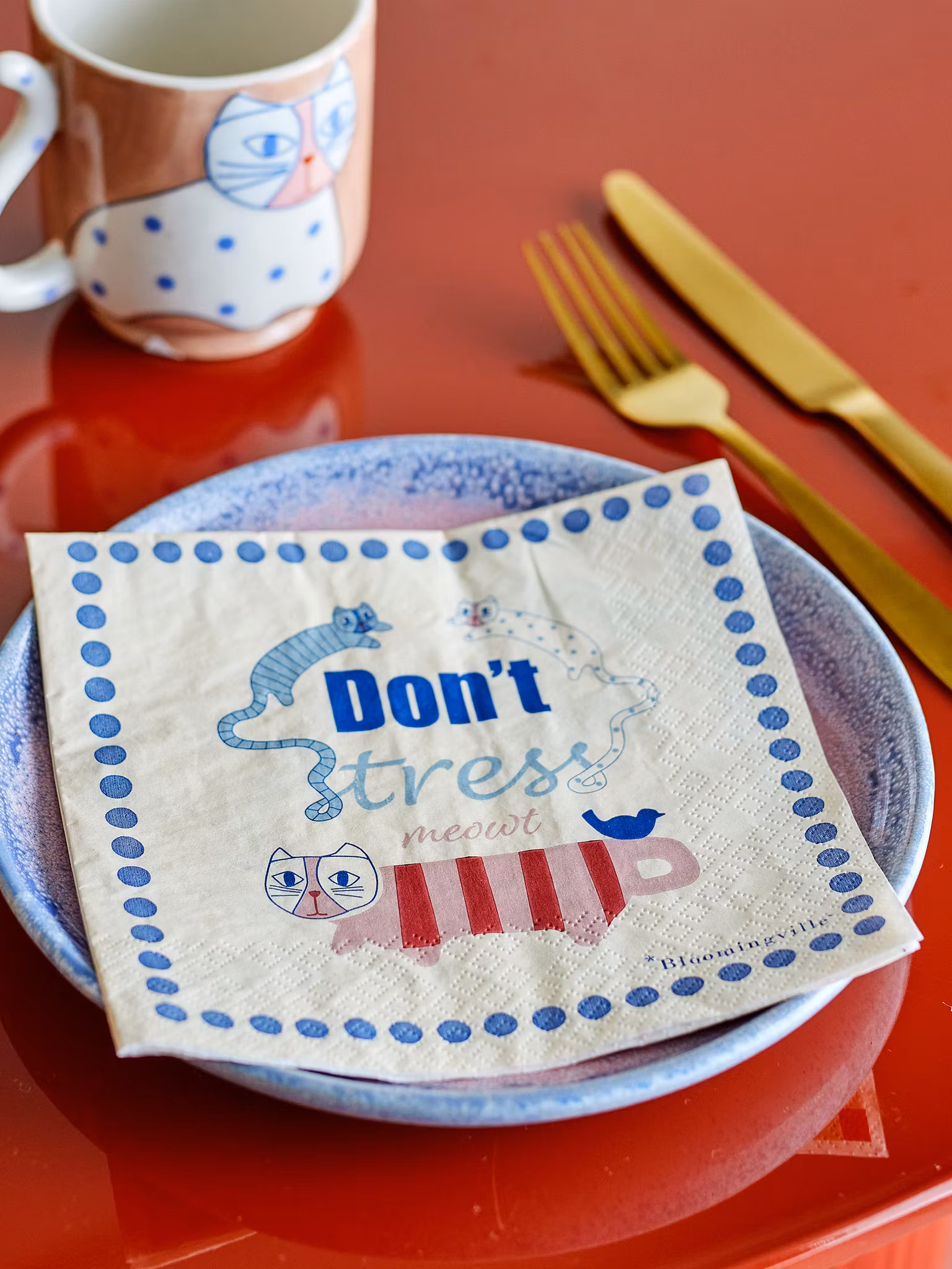 Servetter med katter och texten Don't stress meowt. 20 st per paket i mått 33x33 cm.
