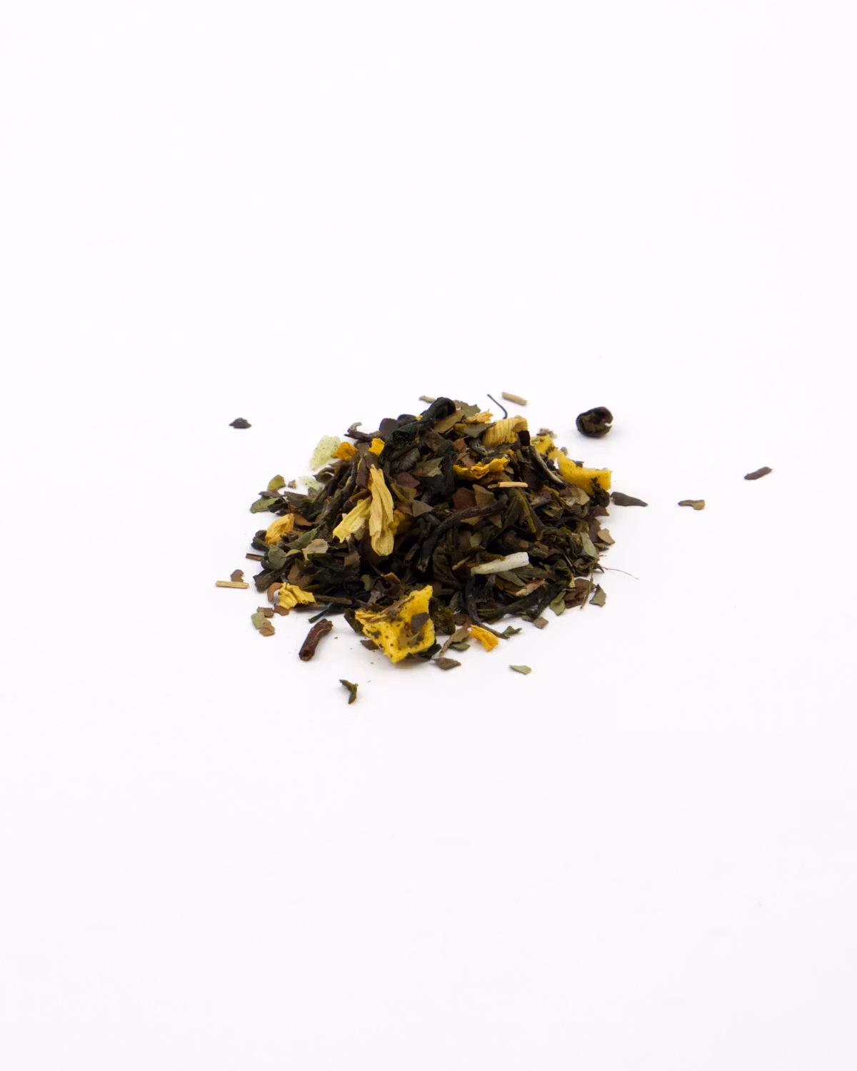 vitt te 45%, grönt te 42%, smakämne, solros blommar, kokosflingor, 3%, passionsfruktsgranulat 2% (glukossirap, koncentrerad passionsfruktssaft, aprikosmassa, Modifierad stärkelse, Förtjockningsmedel: natriumalginat).