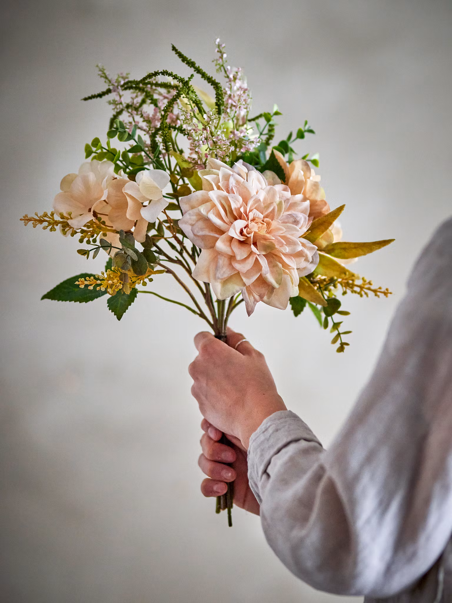 Denna konstgjorda eleganta bukett är perfekt för den mindre vasen och innehåller en stor krysantemum, tillsammans med en mix av gröna blad.