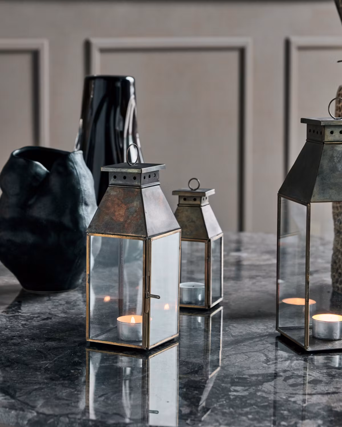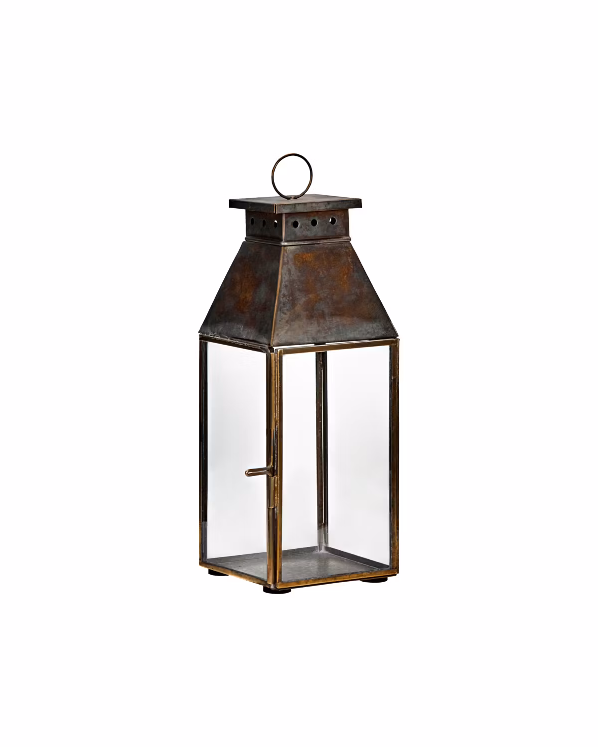 Denna handgjorda lykta i glas och järn med en antik mässingsfinish ger en touch av vintagecharm till vilket rum som helst.
