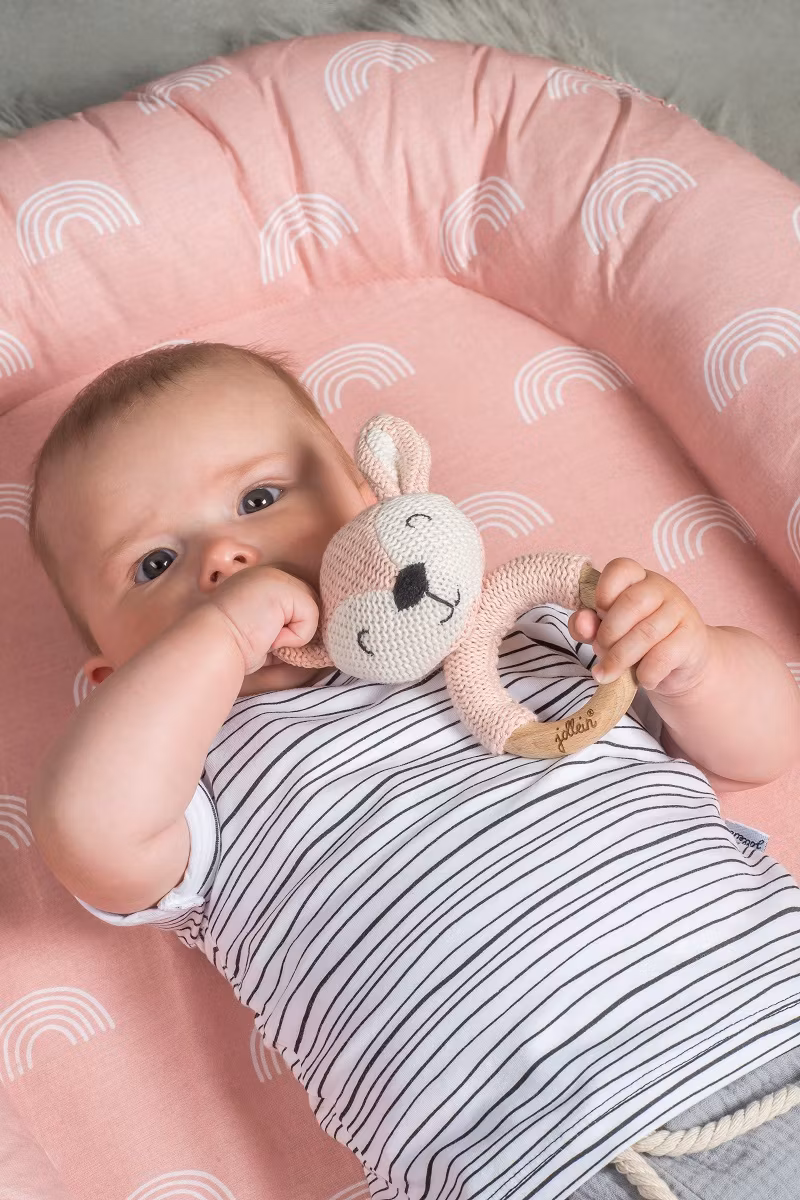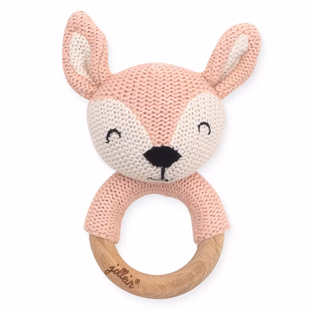 En rolig bitring i trä som lindrar obehaget vid tandsprickning. Designen är kul med en söt stickad hjort i bomull. Bitringen fungerar också som skallra.