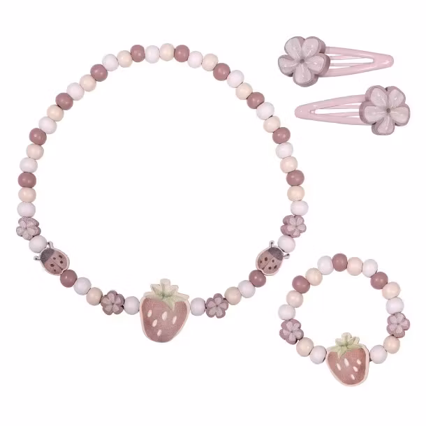 Sött smyckessset i trä med jordgubbar, blommor och nyckelpigor.