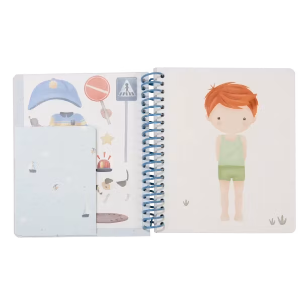 Boken innehåller 24 sidor med bilder och klistermärken med uniformer och tillbehör, som till exempel brandman och astronaut. För inlärning av finmotorik, kreativitet och koncentration.