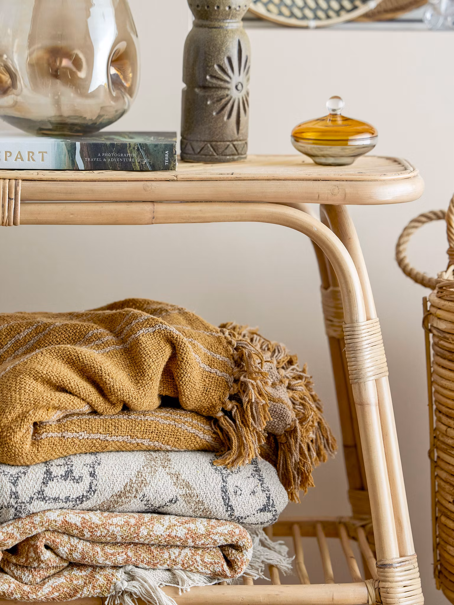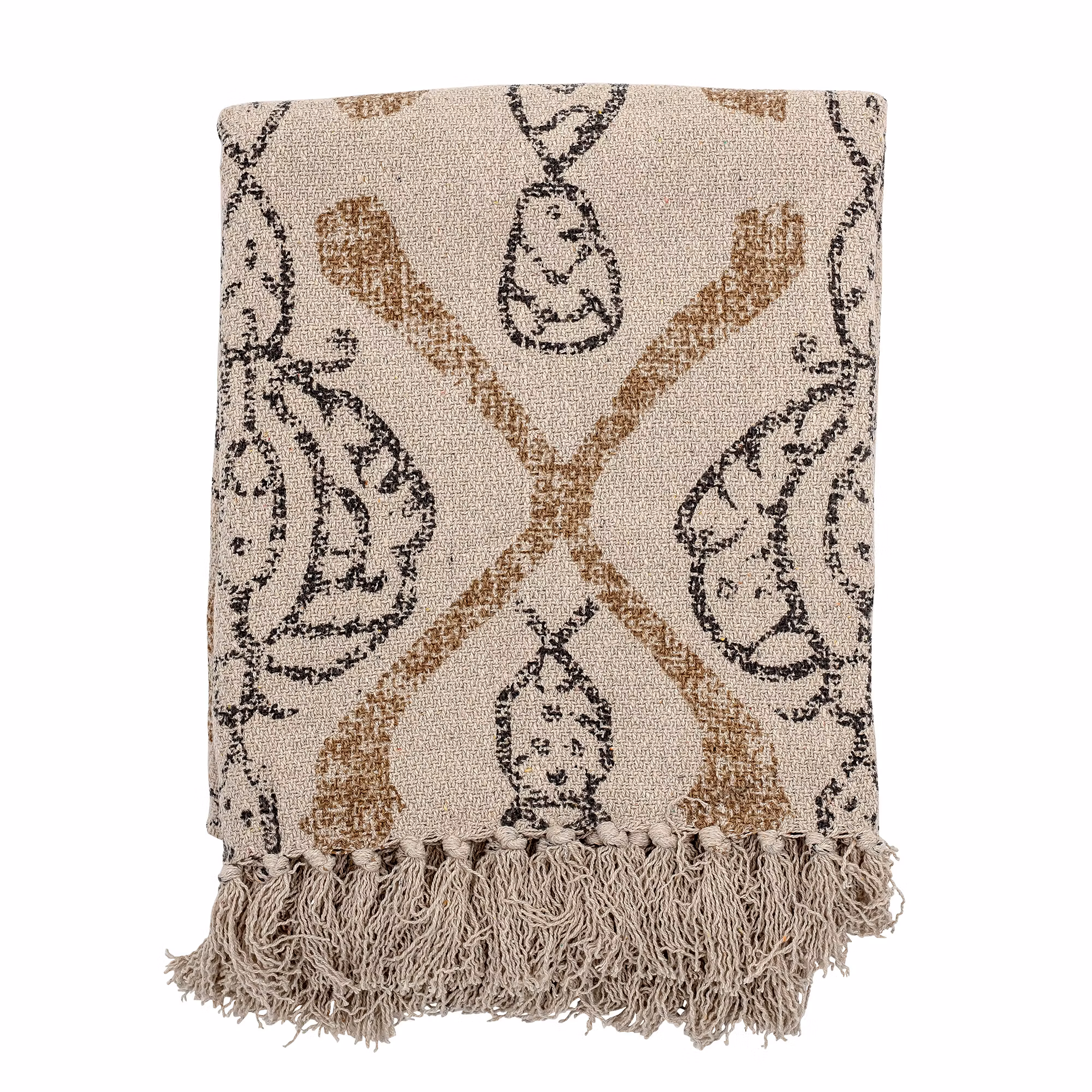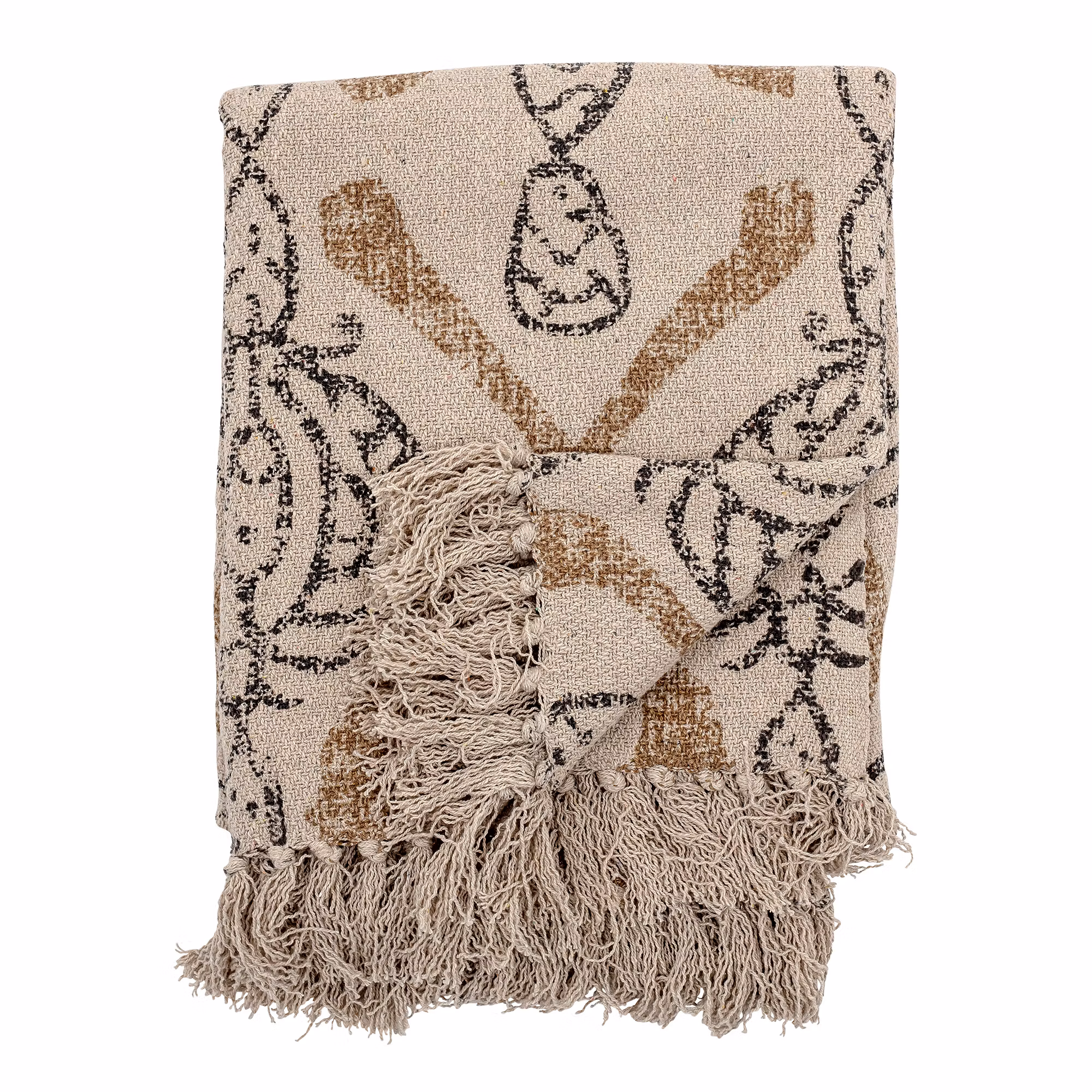 Filt från Bloomingville vävd i återvunnen bomull med ett fint mönster i ockra och svart. Fransar i nederkant.