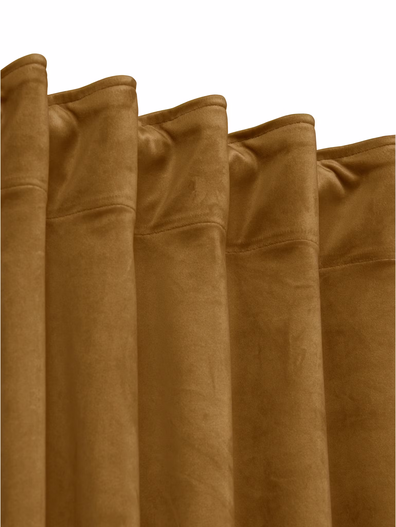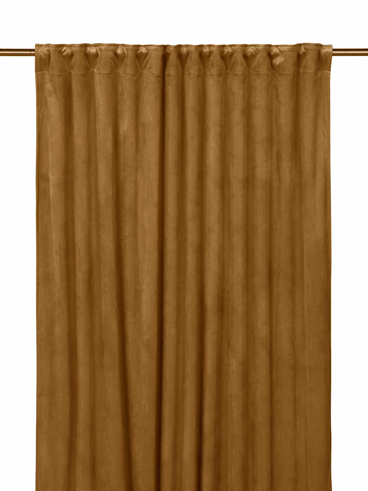 Tygets tjocklek ger en lätt mörkläggningseffekt. Gardinerna har multiband i överkanten, sydda långsidor och overlock-söm i nederkanten. Multibandet är en flexibel lösning som gör att gardinen kan hängas med metallkrokar eller direkt på stången, beroende på vilken veckningseffekt du önskar. Använd easy fix-tejp för att justera längden utan att använda symaskin. Måttet för varje gardin är 135x280 cm, men tänk på att krympningen kan vara upp till 2 % efter tvätt.