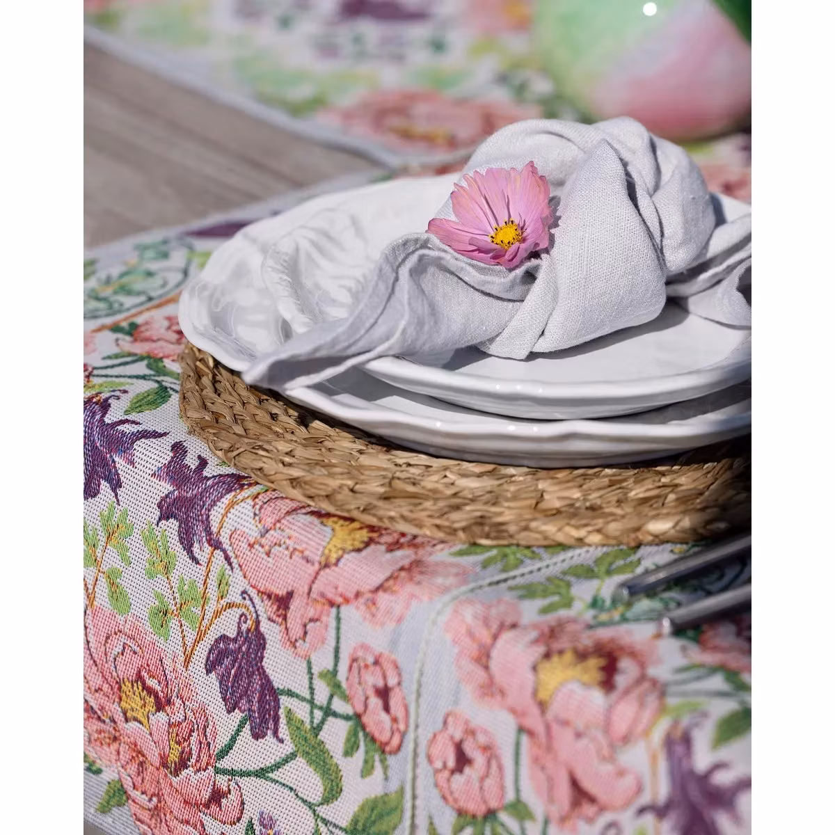 Maskintvätt 60°C. Tvättas med liknande kulörer. Dukar som innehåller lin ska EJ torktumlas. Skaka ut duken ordentligt efter tvätt och häng upp den för torkning. För bästa resultat, stryk duken lätt fuktig i längdriktning. Tips! För extra bra resultat, forma duken efter att du skakat ut den innan upphängning. Alla våra produkter levereras med övermått.
