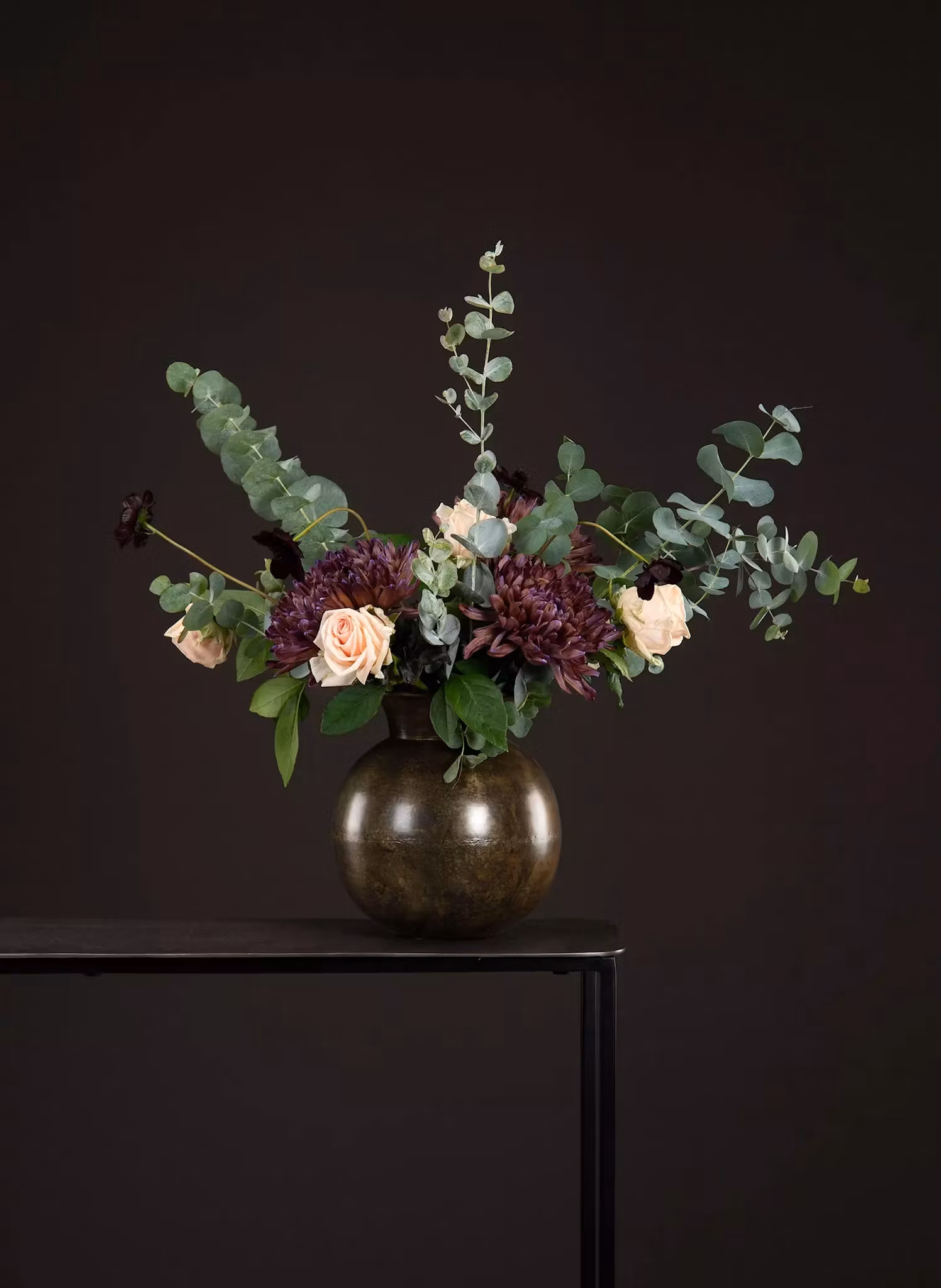 En effektfull rund vas i metall som är vacker både med och utan bukett.